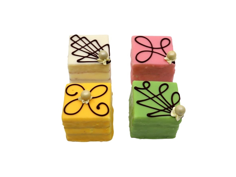 Petit fours opgebouwd van laagjes cake en luchtige creme. Afgewerkt met een chocolade decoratie.