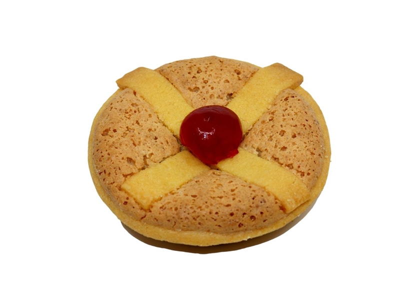 Roomboter koek gevuld met een amandelmakronen-massa, met een frambozenbessen moes erin. De doelenstraatjes worden afgewerkt met een kers