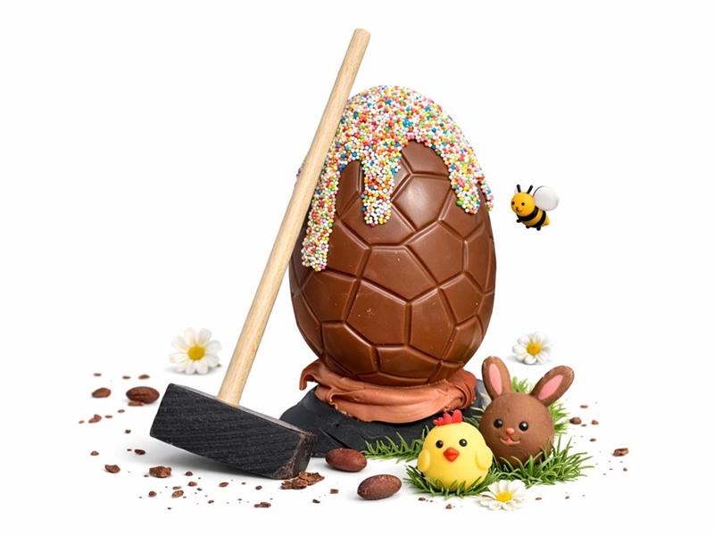 Een echte Eyecatcher op de paastafel, het ei is gevuld met paasbonbons en bonboneitjes. Vandaar de hamer erbij om hem open te tikken.