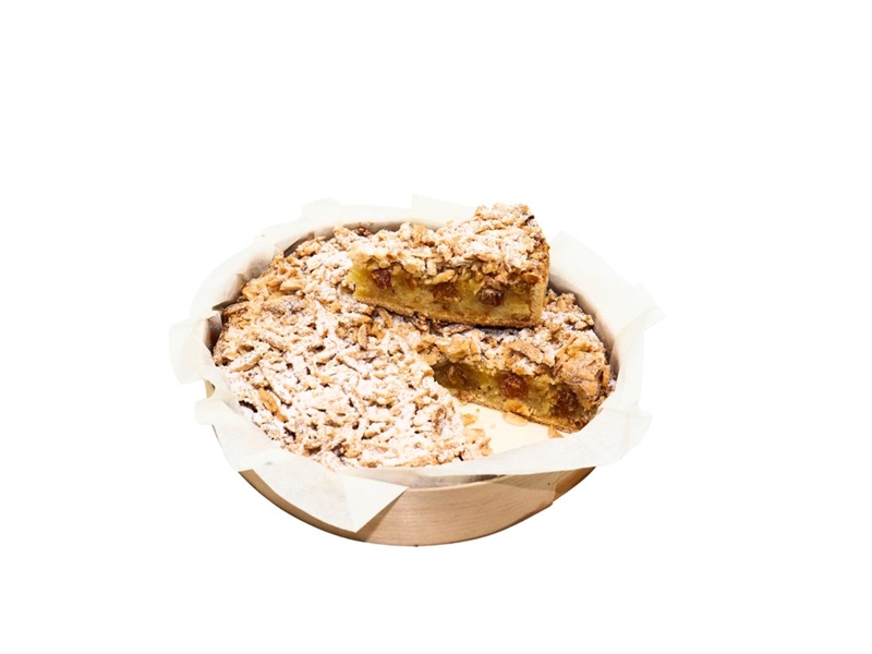 Een luchtige Amandel cake gevuld met stukjes abrikoos, op een koekbodem en bestrooid met een krokant van amandelstiften en citroen.