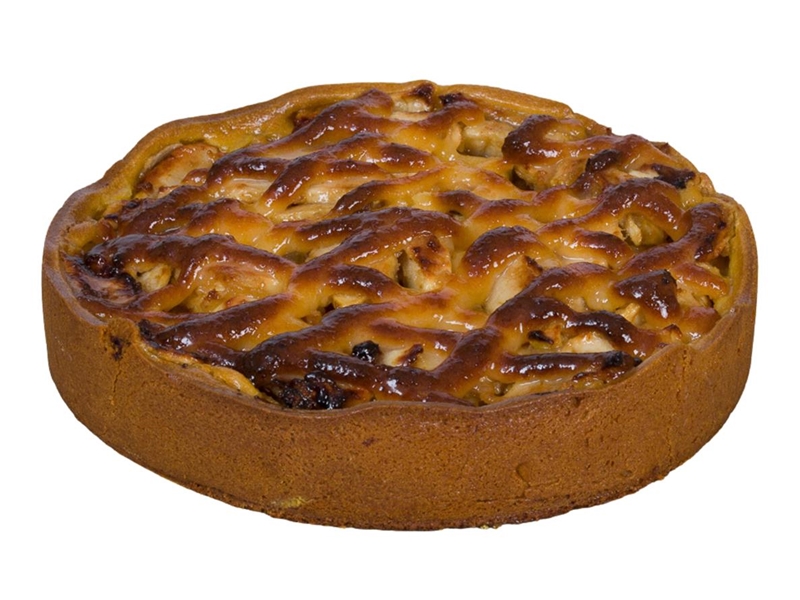 Een ovenheerlijke appeltaart van zacht gebakken roomboterdeeg. Op dit deeg doen onze banketbakkers een dikke laag banketbakkersroom en dit bestrooien ze met kaneelsuiker. Hierop wordt de appelvulling gedaan die aangemengd is met abrikozen en rozijnen en om het geheel af te maken maken we er een raster op van amandelspijs met room