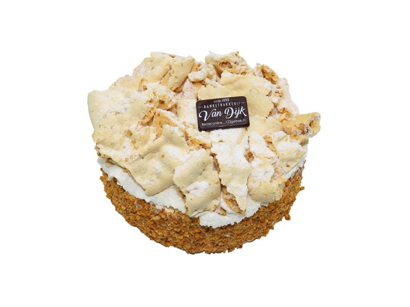 Heerlijk krakend vers hazelnoot schuim, met daartussen een spiraal karamel en een dikke laag slagroom. Aan de zijkanten zit een laag hazelnootkrokant en de taart wordt bovenop afgetopt met slagroom en hazelnootschuim.