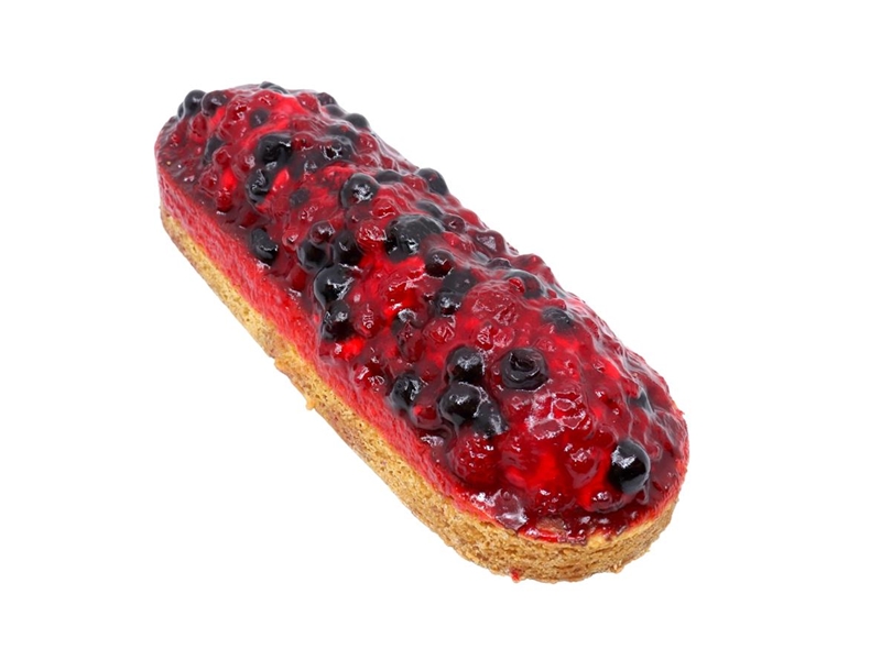Een ovenheerlijke sloffenbodem van zacht gebakken roomboterdeeg, waarin we een Amandel frangipane hebben meegebakken. Daarop doen onze banketbakkers een streep bosvruchtenmoes, en daar overheen een laag slagroom. Heerlijke bosvruchten bovenop en om het geheel mooi af te maken dopen de banketbakkers de sloffen in een mooie helderrode gelei.