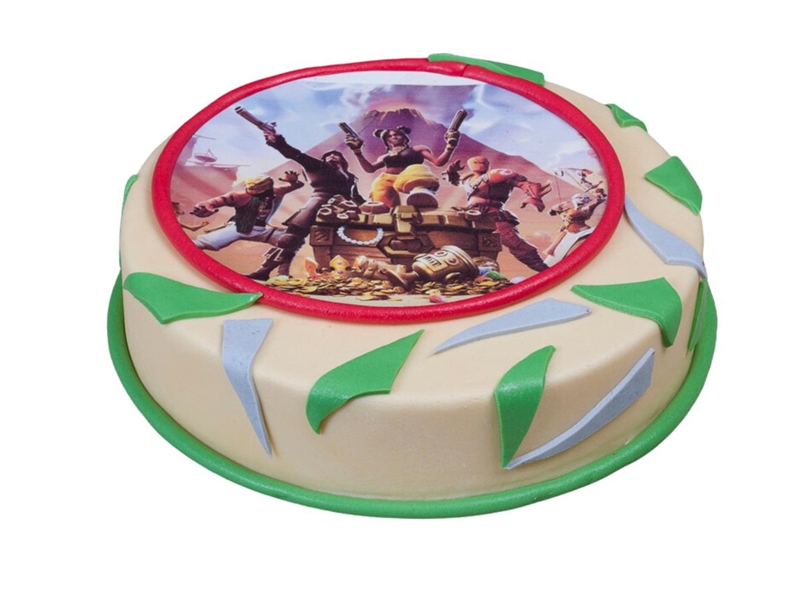 Afgedekt met een laagje marsepein en afgewerkt als Geboorte taart met een ooievaar.