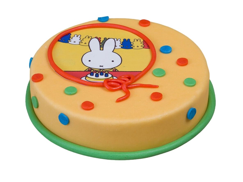 Prachtige Nijntje Themataart! Een heerlijk luchtige Moscovisch cakebeslag, Met onderop een dun laagje Abrikozenjam, Dubbel gevuld met een lekkere creme suisse met een paar vruchtjes. Afgedekt met een laagje marsepein en afgewerkt als Nijntje